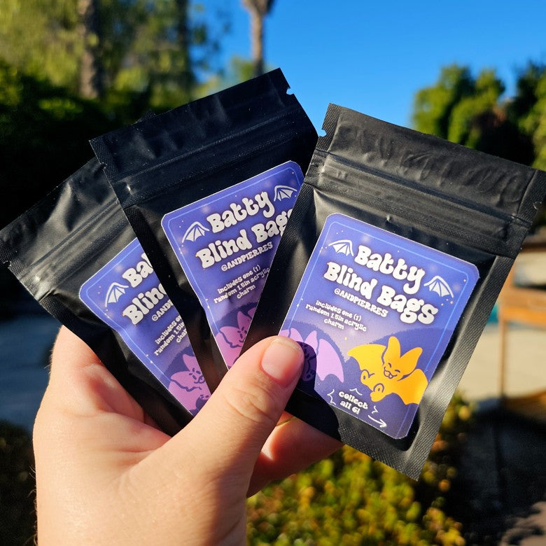 - one (1) mini 1.5in charm, featuring a group of six batty friends for you to find -- either as a single blind bag pull, or your choice of bat for a slightly higher price!